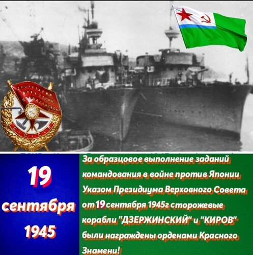 19 сентября 1945г пограничным сторожевым кораблям "ДЗЕРЖИНСКИЙ" и "КИРОВ" (первого поколения, эти корабли были итальянской постройки) были вручены Ордена Красного Знамени, по приемственности имён, одноименным кораблям следующего поколения пр.264А также перешли ОРДЕНА КРАСНОГО ЗНАМЕНИ, а вот в третьем поколение, Орден Красного Знамени перешёл только к Дзержинскому пр.1135.1, а Киров был отдан Украине и переименован!